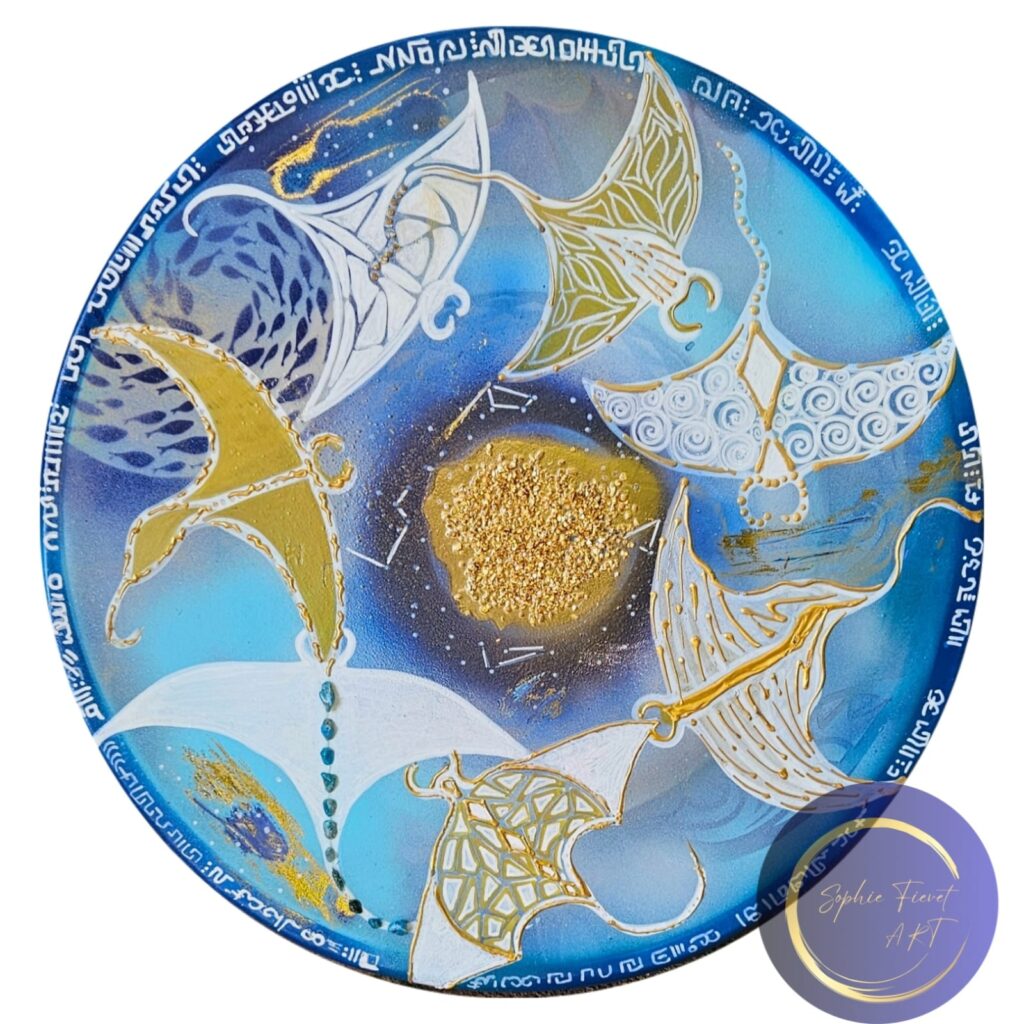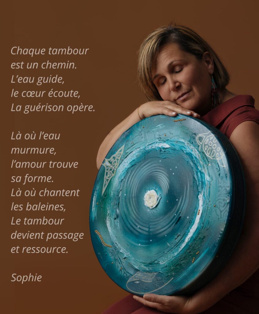 La création sur des « tambours océan », est pour moi une manière de fusionner l’art, le son, la vibration et l’éveil intérieur. Ces créations offrent un moyen de connexion authentique avec sa propre intériorité , avec les autres et le monde des océans. Le tambour océan est bien plus qu’un instrument de musical, c’est un outil puissant en auto- soin qui permet de retrouver son propre rythme et de se réharmoniser en quelques minutes seulement. C ‘est permettre un changement de fréquence qui favorise le retour à l ‘unité en soi.